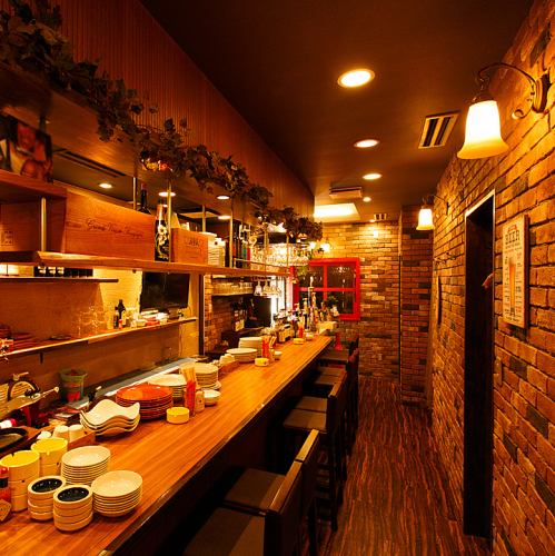 【臨場感たっぷりの人気カウンター席】目の前で調理の香りや音を感じながら、シェフとの会話も楽しめる特等席。一人飲みやデートにもぴったりな温かい雰囲気が魅力です。レンガ壁に囲まれたヨーロピアンバルで、グラスを傾けながら贅沢な時間をどうぞ。